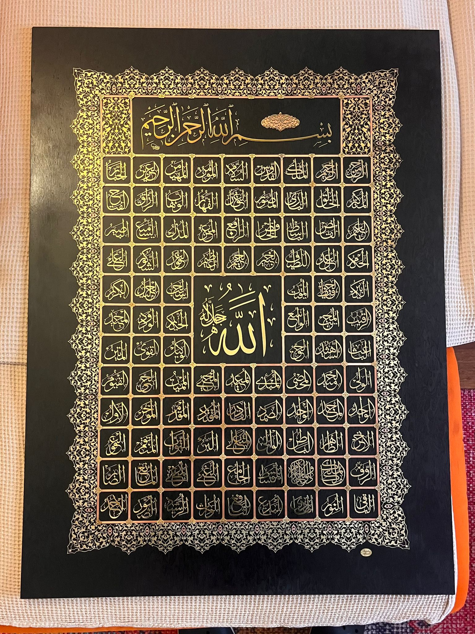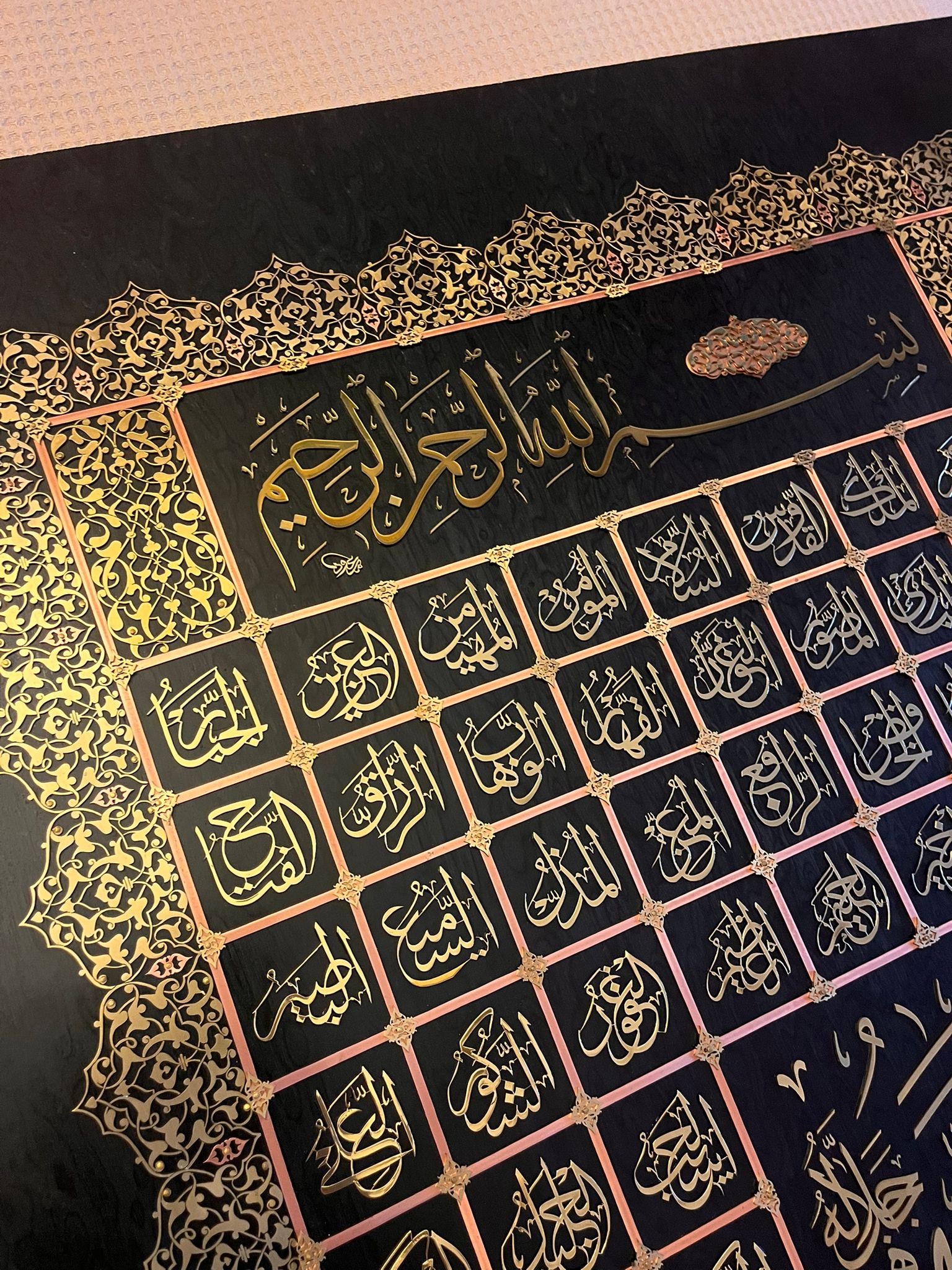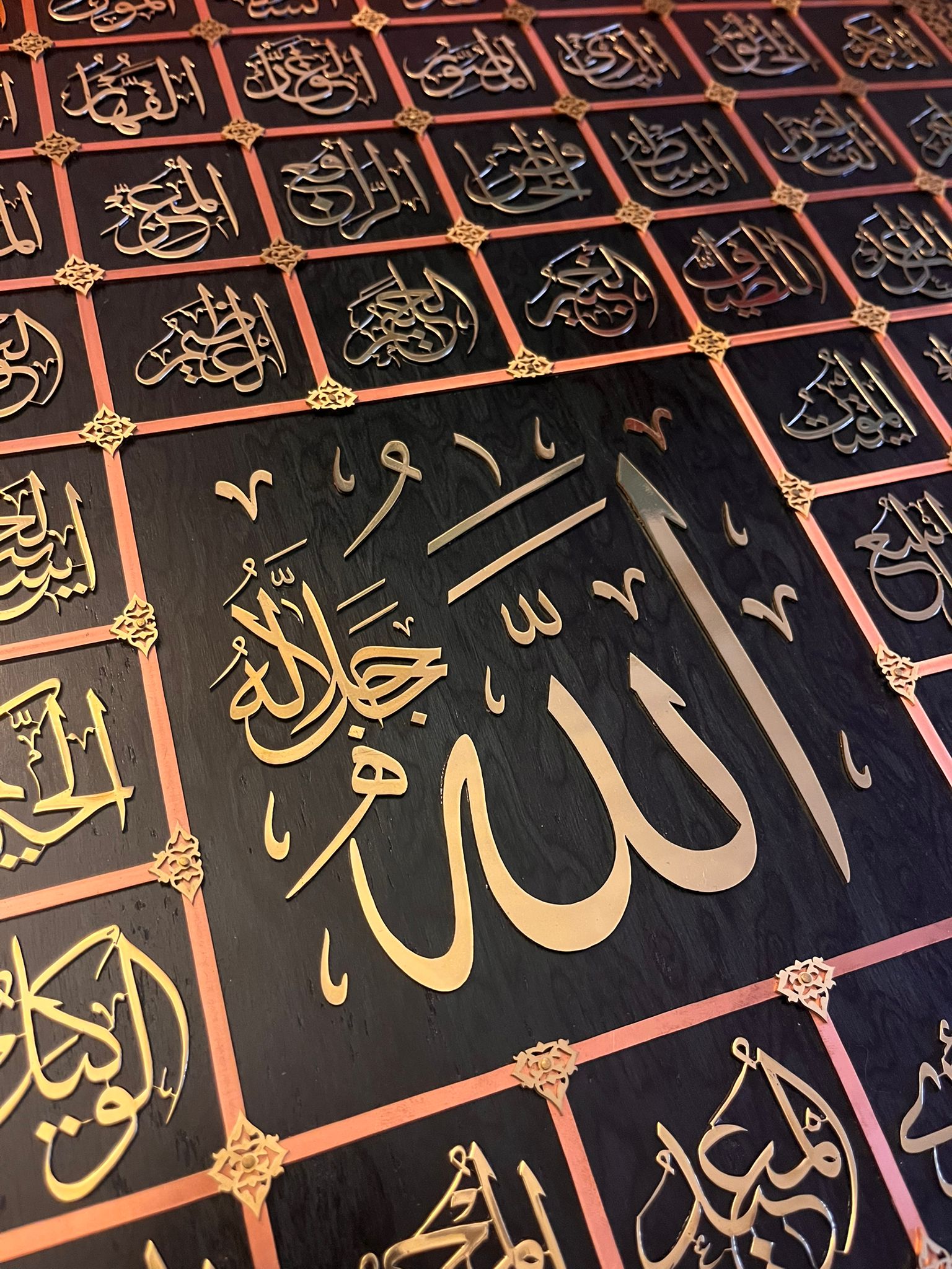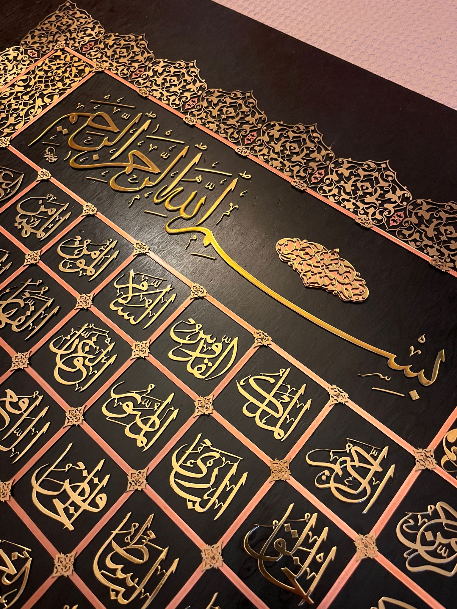 Zemine gomalak uygulanmıştır. Hat ve Tezhip desenleri bakır ve bronz kesilerek hazırlanmıştır. Geleneksel yöntem ile elde kesilerek ortaya çıkarılmıştır.