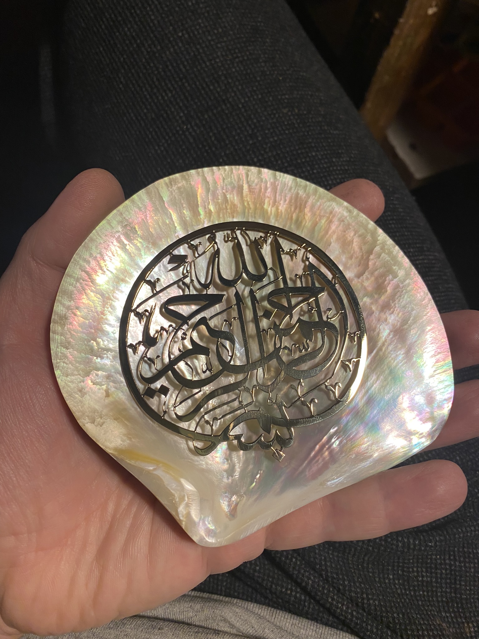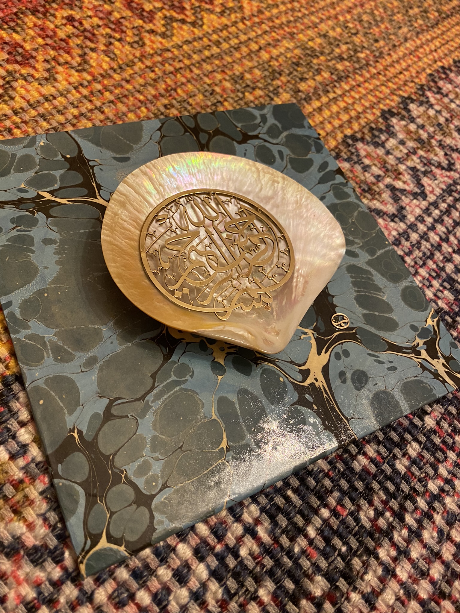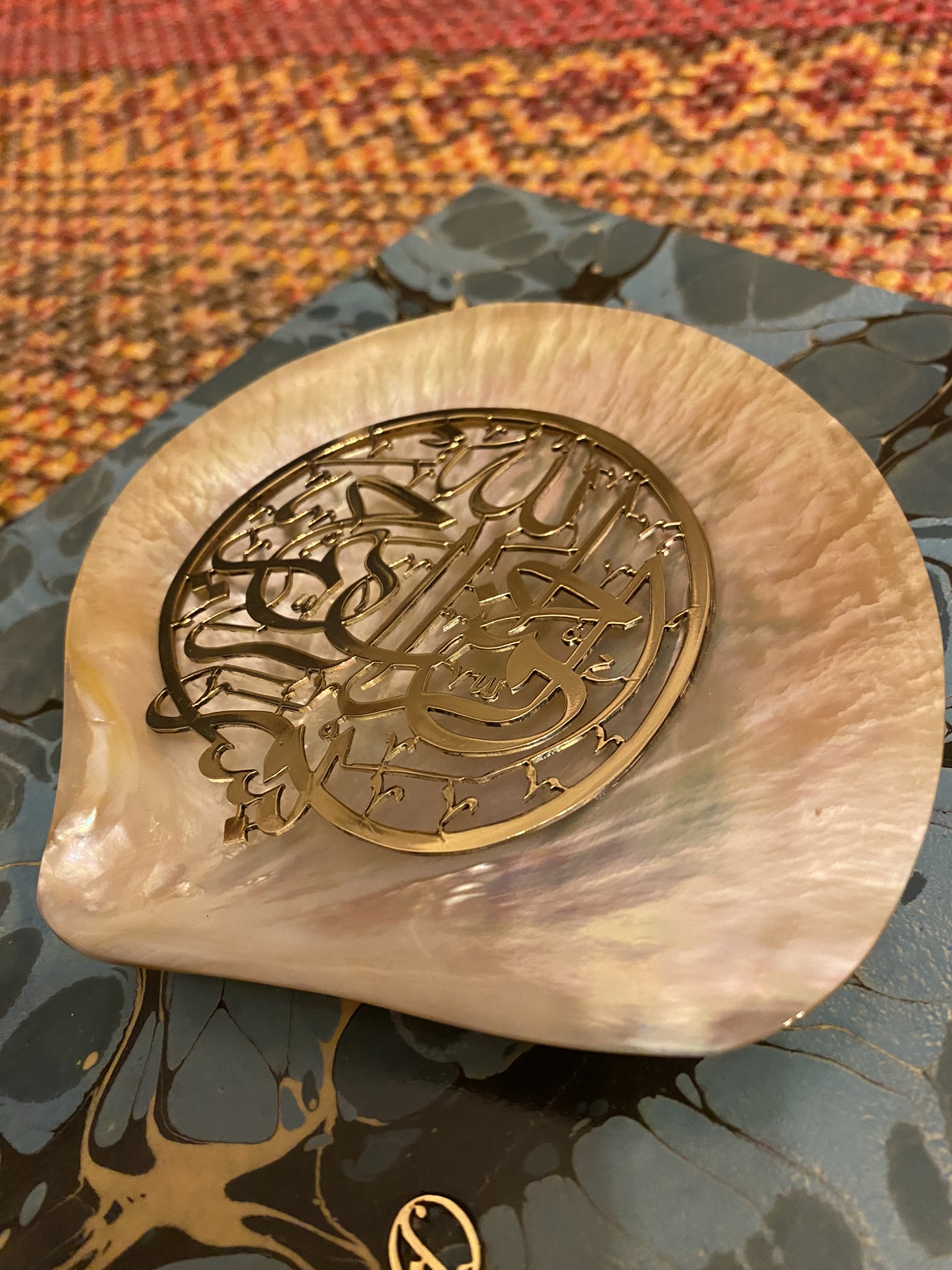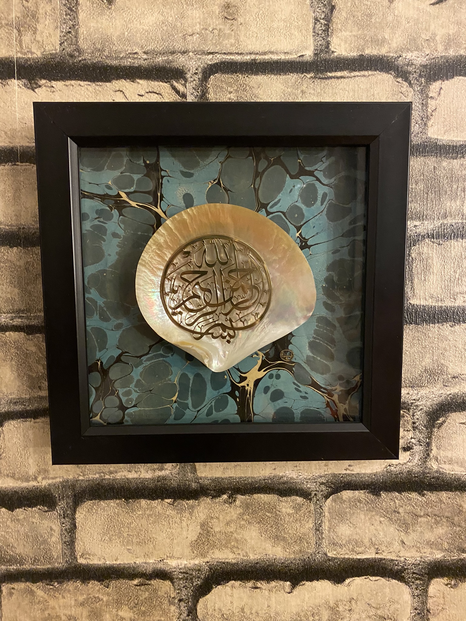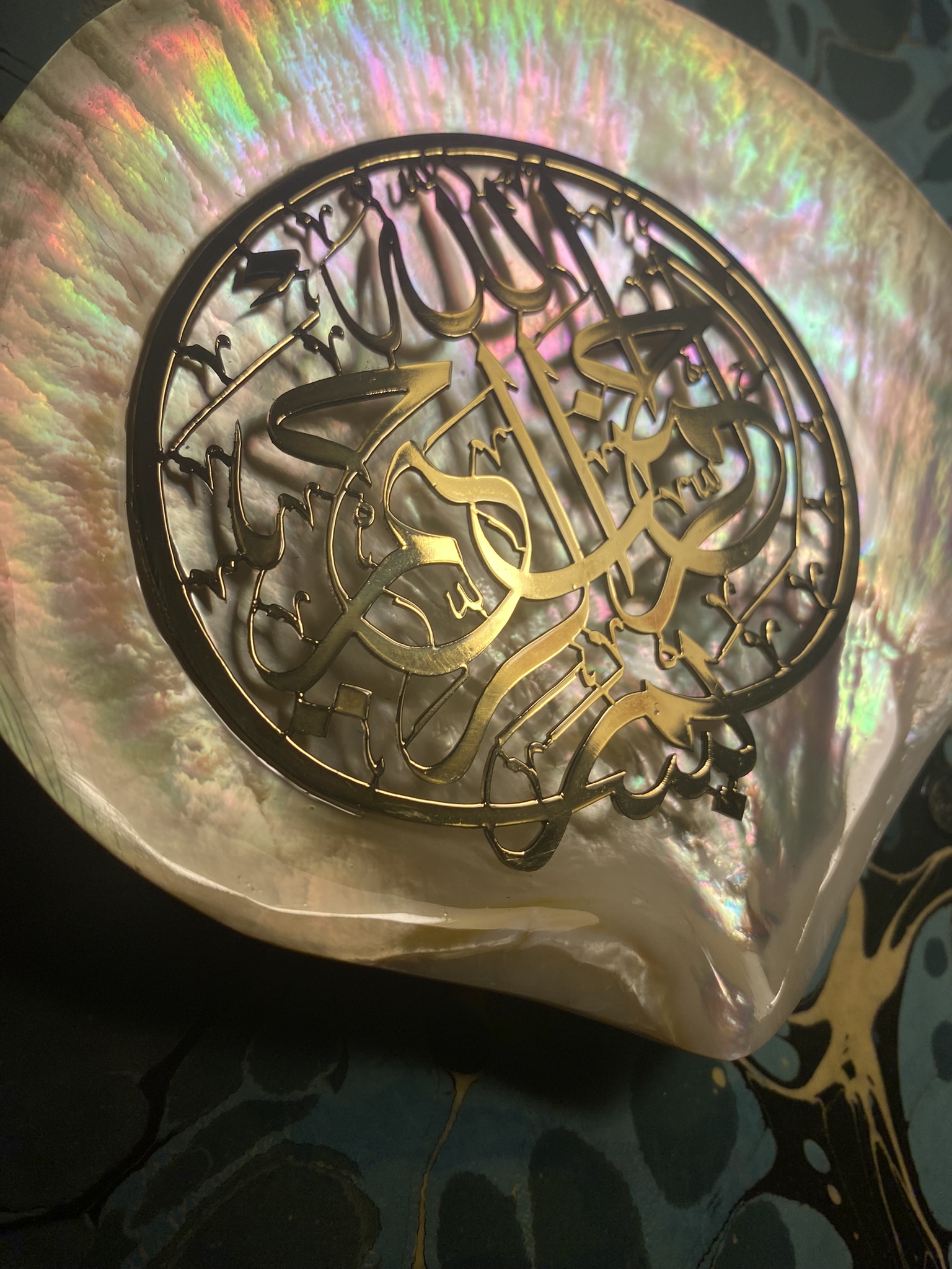 Besmele, Sarı Metal (Pirinç) kesilerek sedef içine uygulanmıştır. Zemine Ebru kaplama uygulanmıştır.