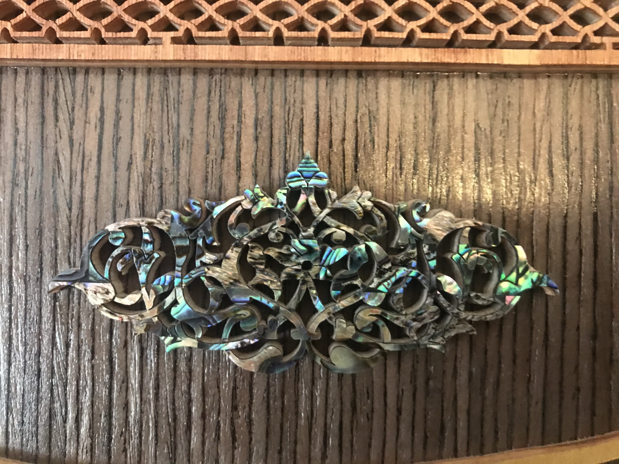Ahşap olarak üç farklı kaplama uyulanmış kontraplak kesim yapılmıştır. Metal olarak alpaka, bakır ve sarı metal (pirinç), Sedef olarak taş sedef ve abanoz sedef kesim yapılmıştır.