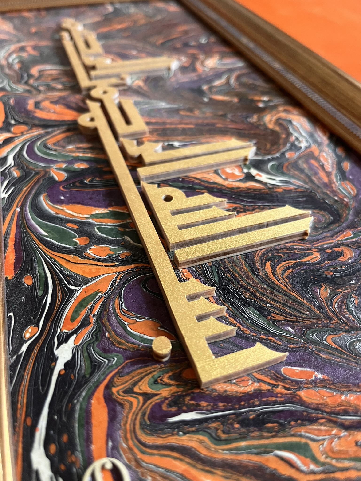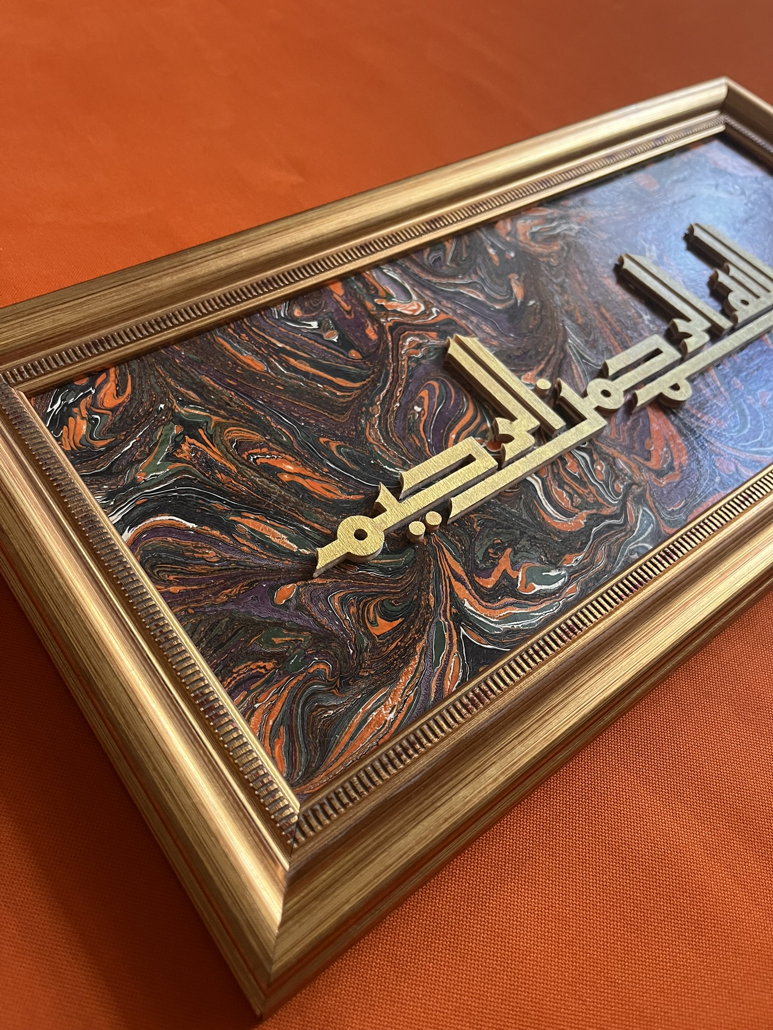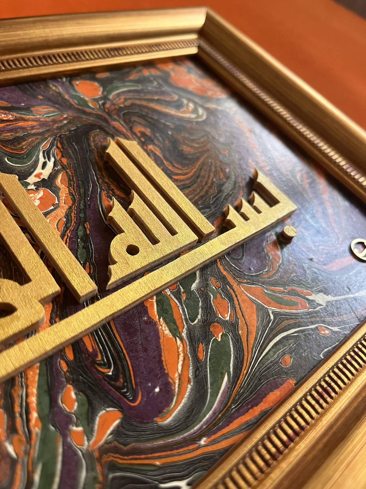 Kayın kontradan kesim yapılmıştır ve Altın Yaldız boya ile sonlandırılmıştır. Zemin Ebru kaplama yapılmıştır.