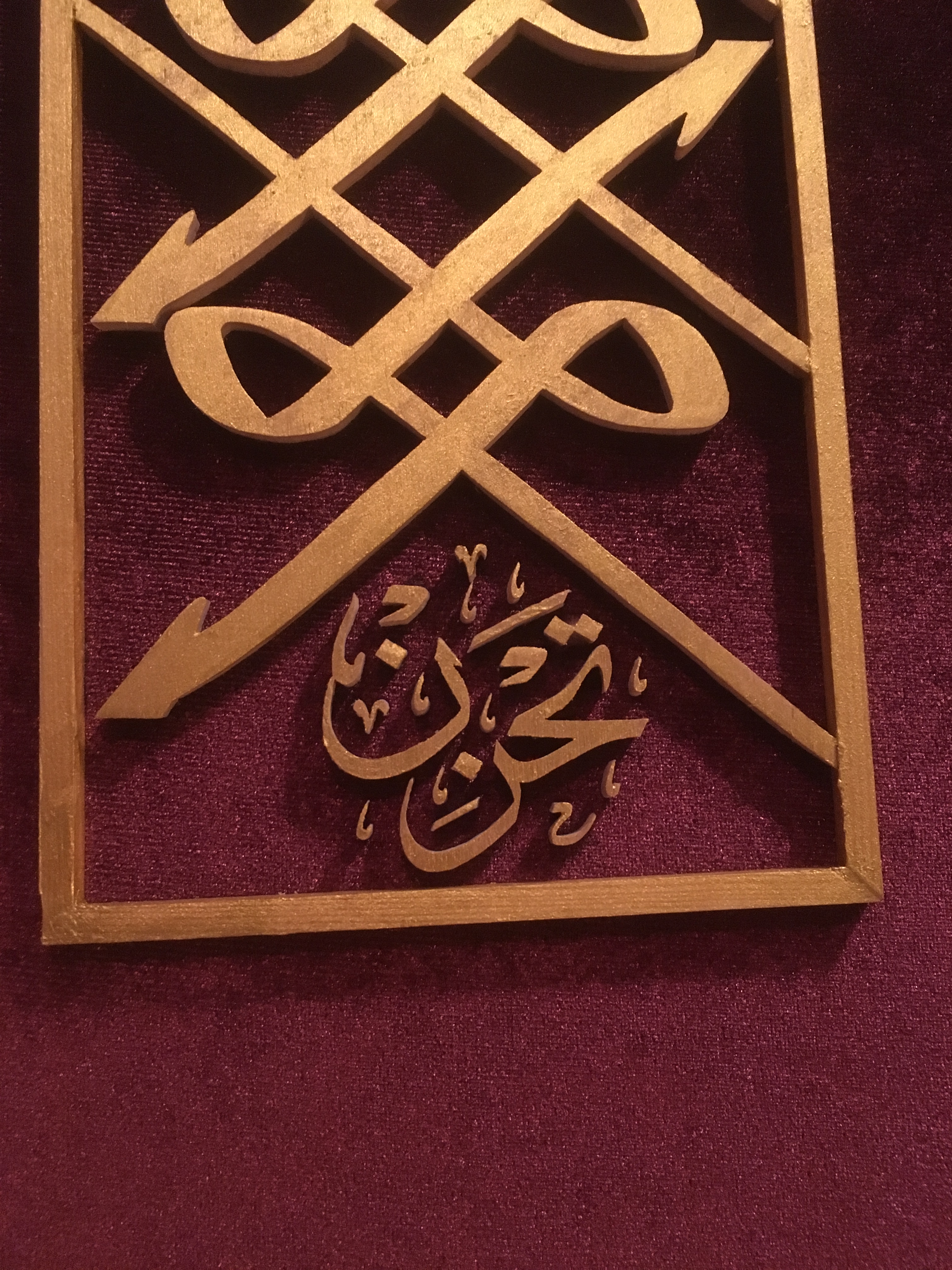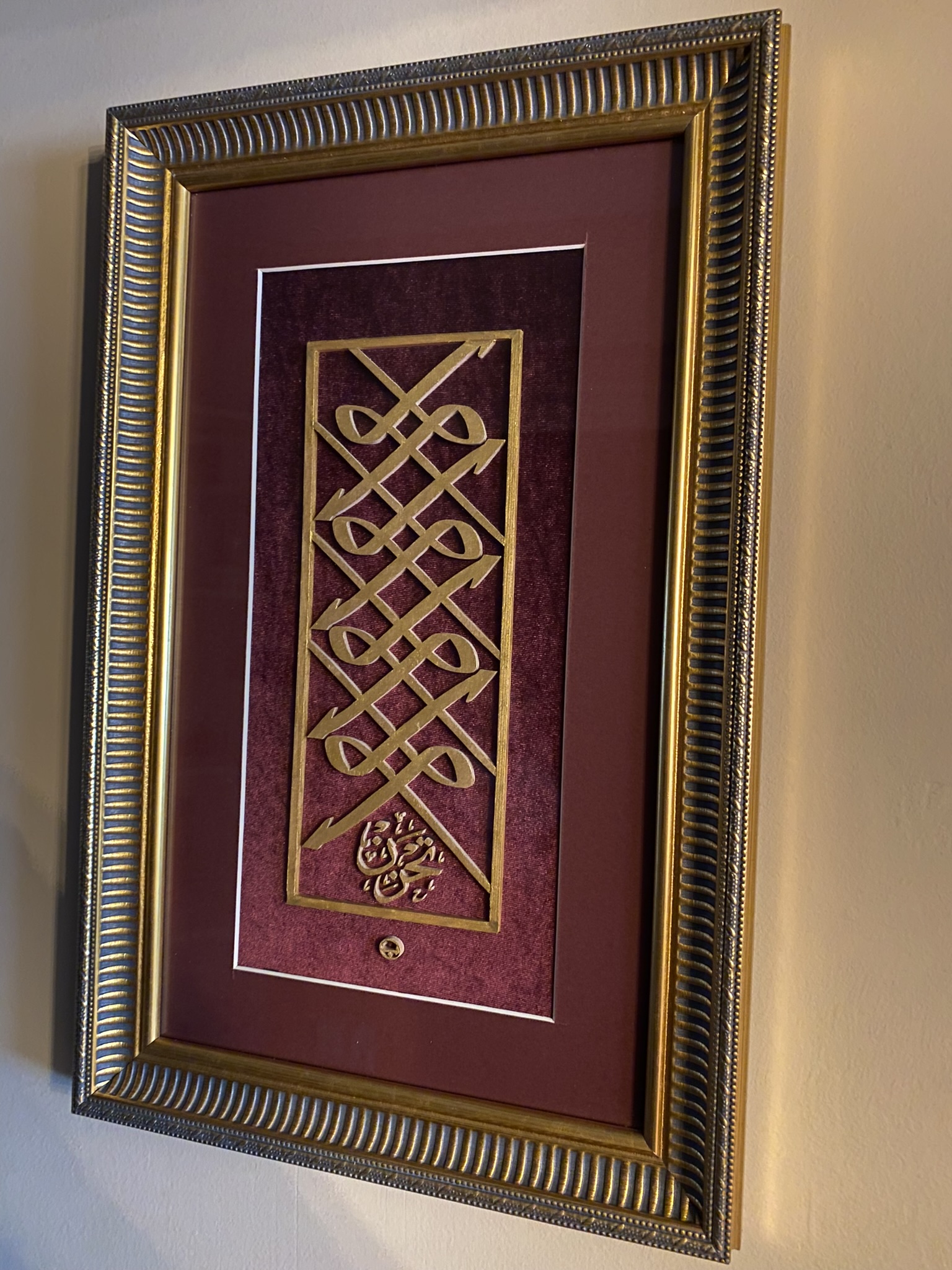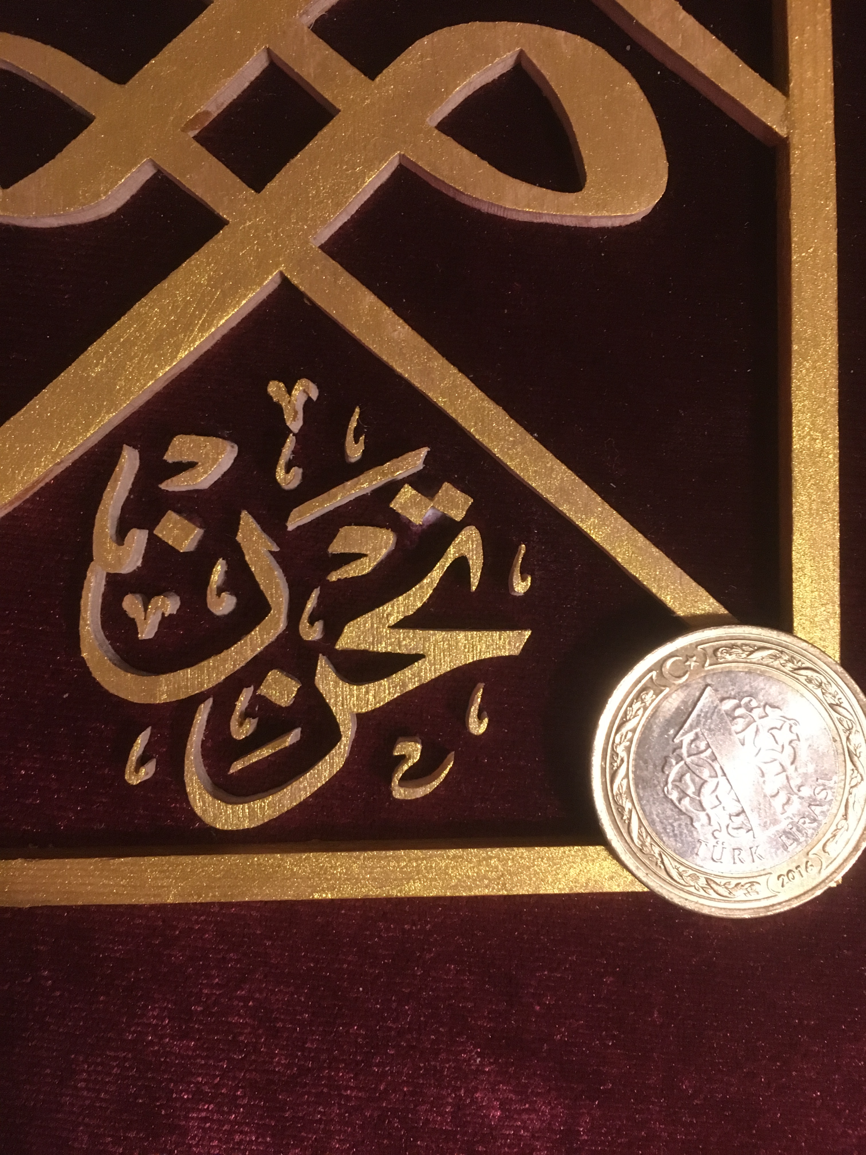 Kesim de Kayın kontrplak kullanılmıştır. Altın Yaldız boya ile sonlandırılmıştır. Zemine Kadife kaplama yapılmıştır.