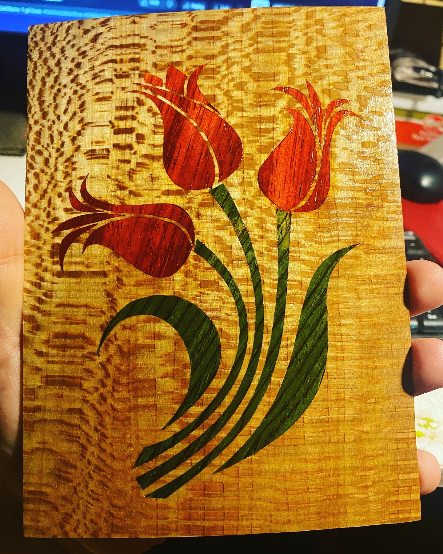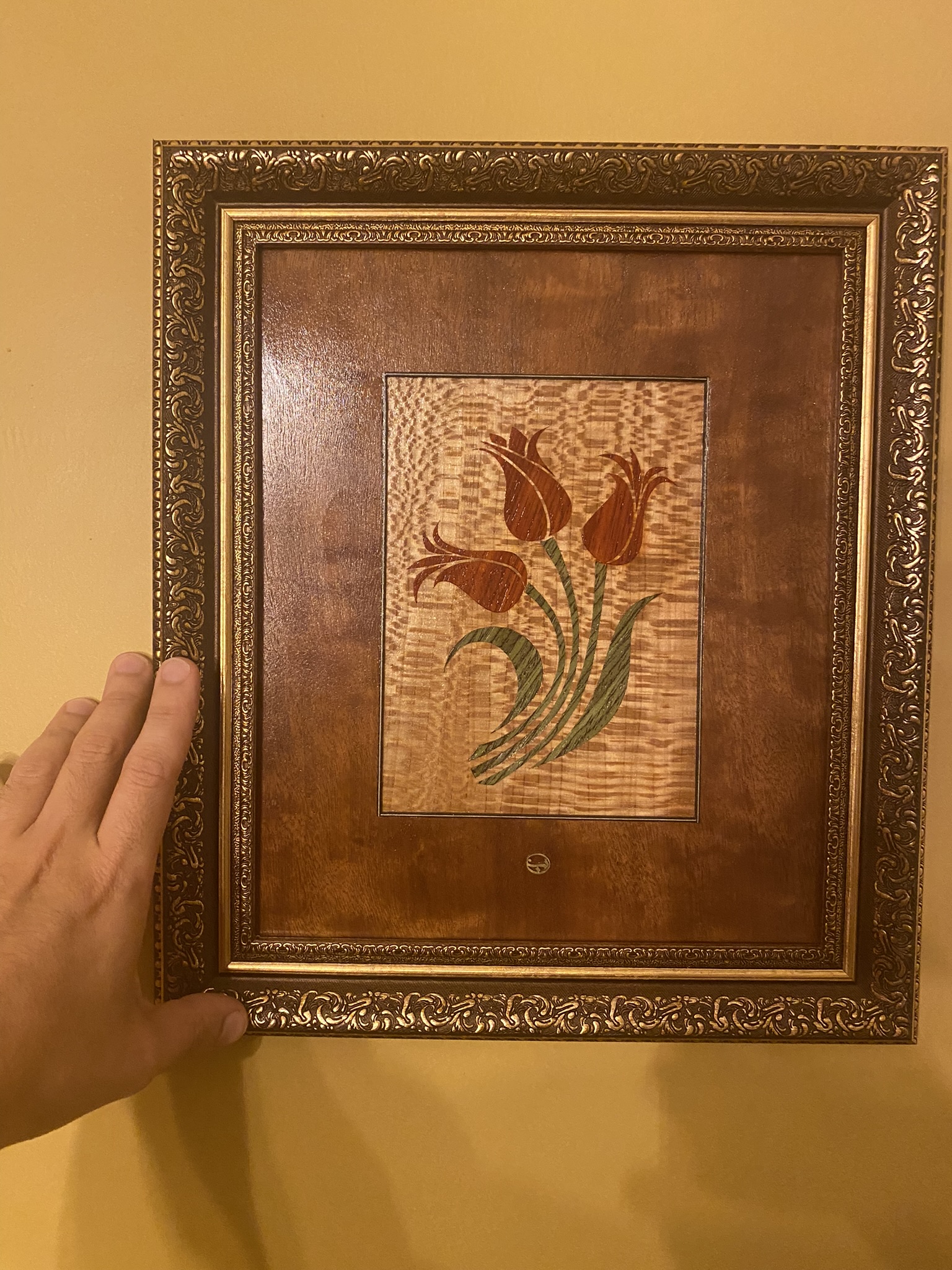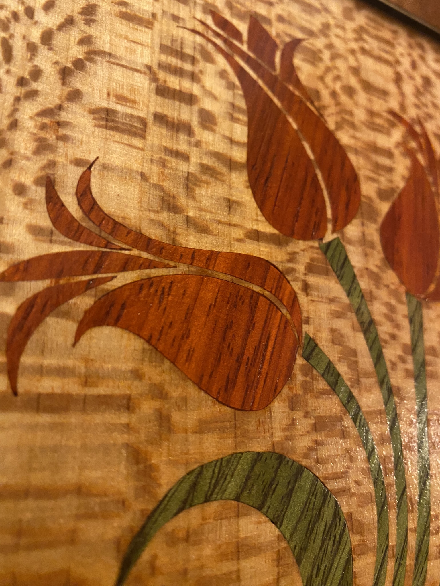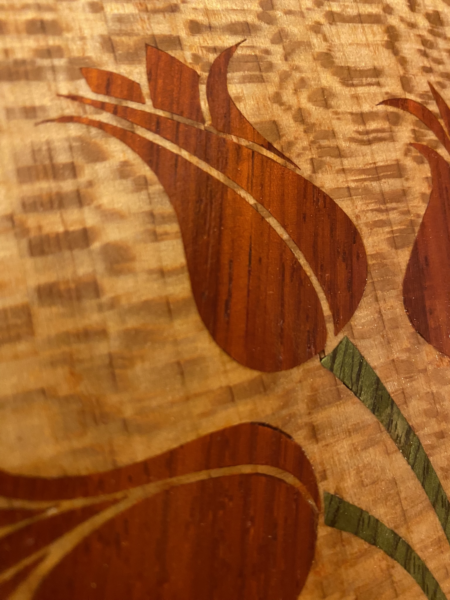 Zemin olarak Brezilya Çınarı masif kullanılmıştır. Laleler Paduk ağacından kesilmiştir. Lale sapları Yeşil Masiften kesilmiştir. Lale kesimleri, zemine kakılarak sonlandırılmıştır.