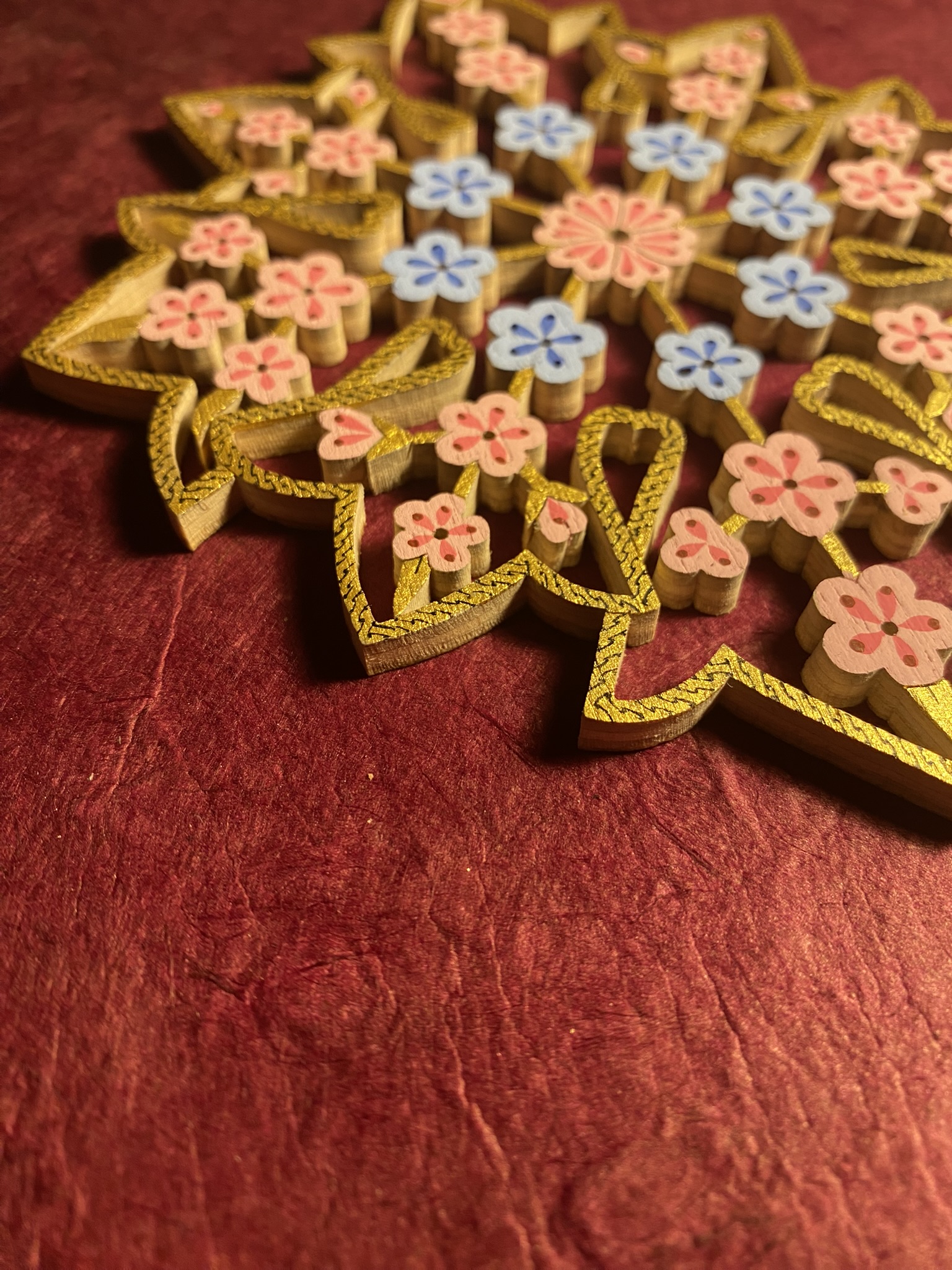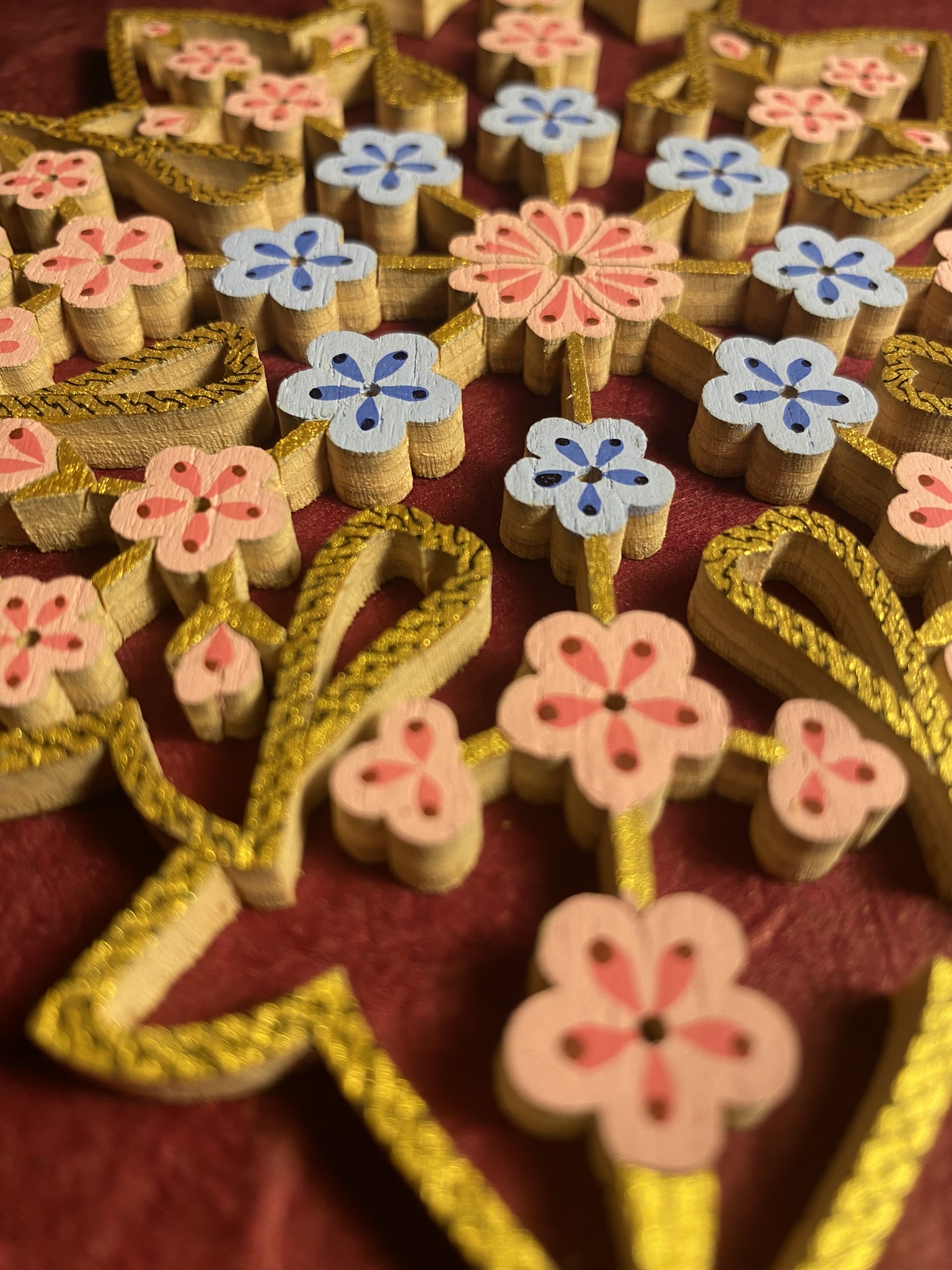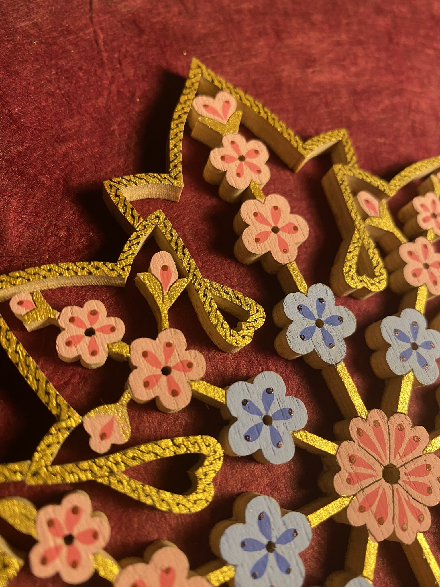 Kesim Kayın kontraplaktan kesilmiştir ve kesime Tezhip uygulanmıştır. Zemin Aharlı Kağıt ile kaplanmıştır.